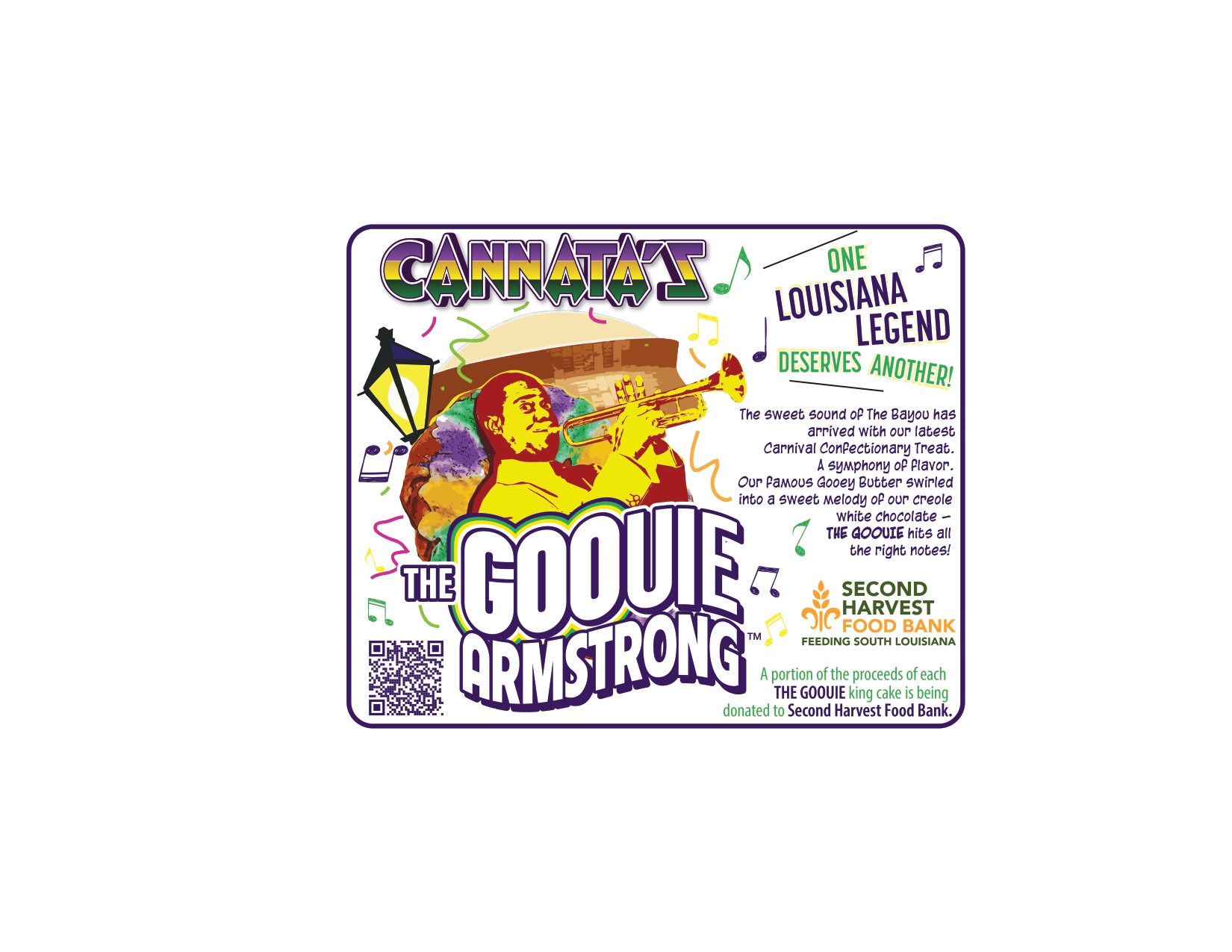 The sweet sound of The Bayou has arrived with our latest Carnival Confectionary Treat!  Our Famous Gooey Butter swirled into a sweet melody of our creole white chocolate!  A portion of all proceeds of each “The Goouie Armstrong” sold will be donated to Second Harvest Food Bank of Louisiana!