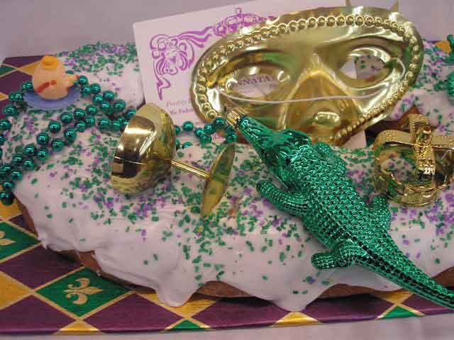 Fully Decorated Filled King Cake, Decorative Mardi Gras Mask, Decorative Mardi Gras Bead, Gold Champagne Cups, King’s Crown, Small Baby and King Cake History Card. The Bayou Alligator is filled with cream cheese and pecan praline!