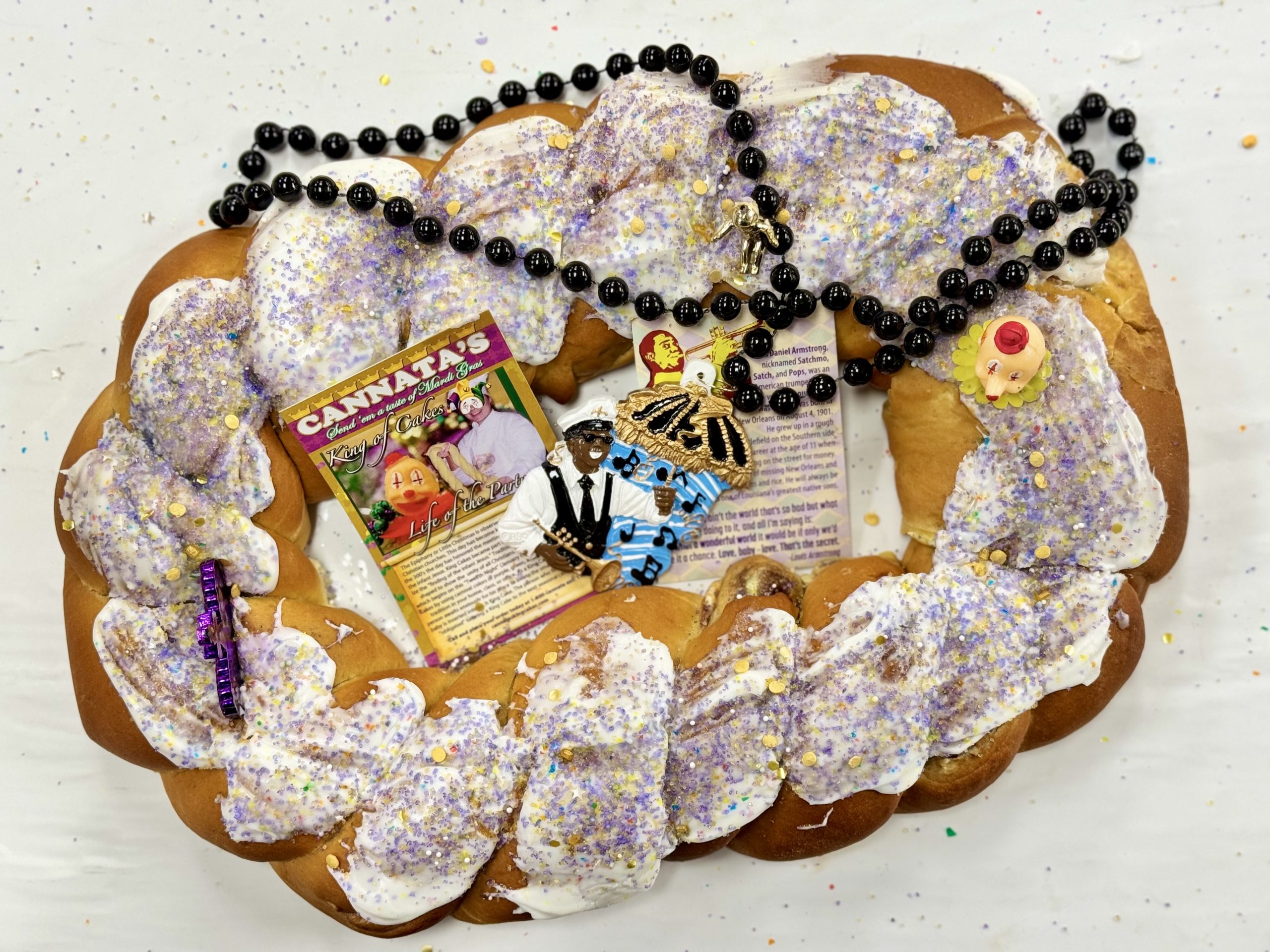 For safety reasons, we never bake the baby inside our king cakes. Each cake comes with the traditional baby placed on top for you to hide before serving. This keeps the fun—and not the hazards—in the celebration. Tradition says whoever finds the baby supplies the next king cake… so let the good times roll! 🎉👶💜💛💚