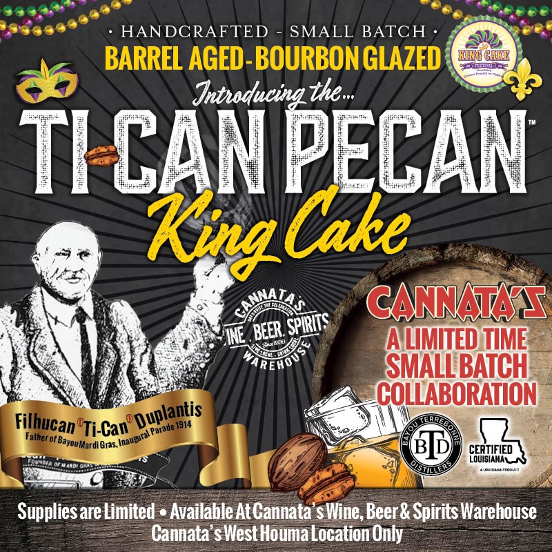 Barrel Aged-Bourbon Glazed King Cake; a Small Batch Collaboration with Bayou Terrebonne Distillers has arrived! Glazed with Good Earth Bourbon, cream cheese filled with a Burbon Gooey Butter topped with Bourbon Soaked and Roasted Pecans makes this one tasty treat good for the entire family. A tribute to the Father of Mardi Gras here on the bayou, Ti-Can Duplantis. Each cake is adorned with a special bourbon barrel bead and a ceramic Mardi Gras mask ornament.